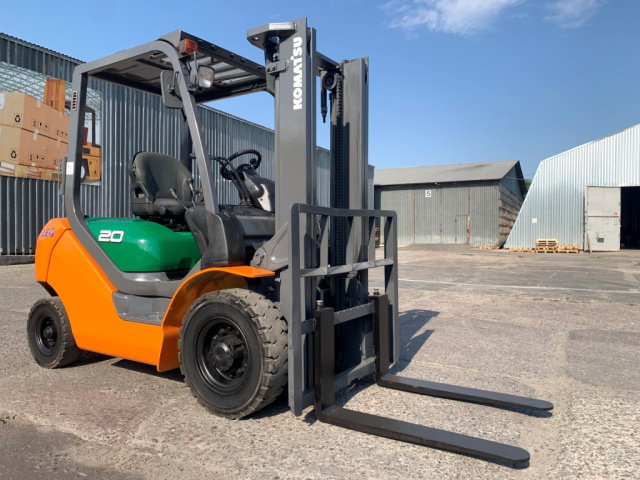 Вилковий автонавантажувач Komatsu на великих 12 колесах. Модель:FG20C-16. Випуск листопад 2005 (напрацювання 10211 м/год). Номінальна вантажопідйомність 2 тонни. Максимальна висота підйому вантажу 3 метри. Габаритна висота 2.04 метри. Щогла двохсекційна (duplex) яка не втрачає вантажопідйомності при висоті підйому. Коробка передач проста механічна 2-ступінчаста, що також дозволяє встановити вiдвал. Обладнаний карбюраторним двигуном, який маловимогливий до якості палива і головне ремонтопридатний - Nissan K21. 4-циліндровий, робочим об'ємом 2.1 літра і потужністю 48 к. с. який славиться своєю надійністю, невибагливістю та головне економічністю, і з деякими змінами в інжекторному виконанні випускається до сьогодні. Управління гідравлікою здійснюється простою і перевіреною часом системою-важелями. Колеса 12 діаметра на ведучiй осі, що покращує прохідність автонавантажувача і збільшує його кліренс.